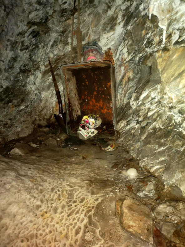 And, the end of this mine, an upturned ore cart, broken shovel, skull mask, and an ominous looking noose hanging from the ceiling. A little memorial to remind me that this isn't mine own private discovery (but the calcite - beautiful!)