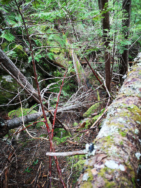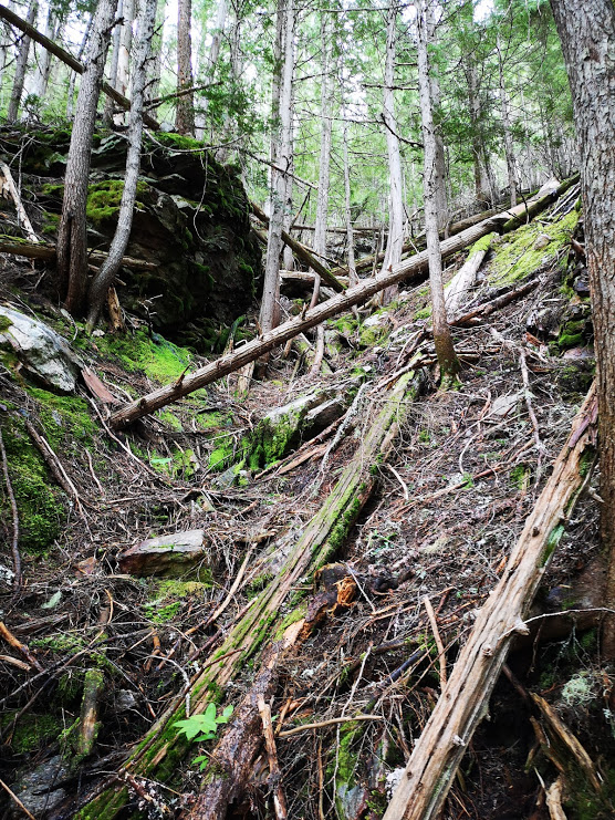 Ferocious terrain to bushwhack through, high-stepping fallen trees, always at 45 degrees, always uphill, and not a trail in sight.