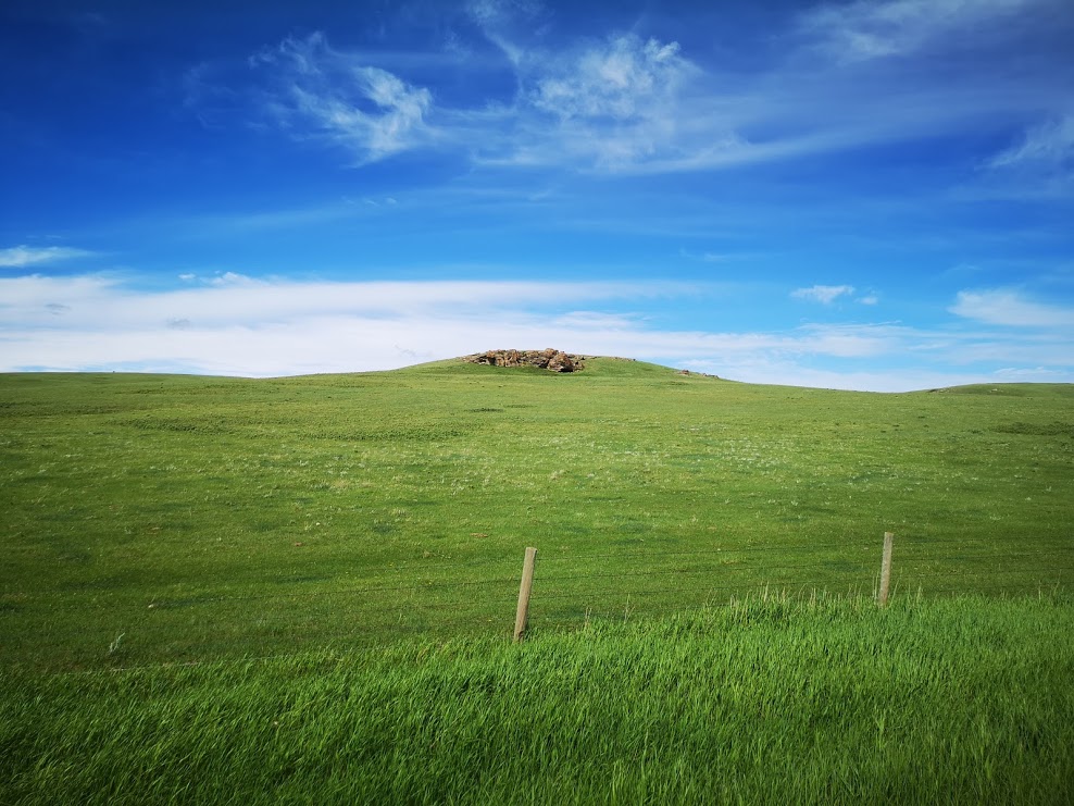 A sandstone butte in a field, on the right-hand side at the base there's a tunnel into the side, next time I'm going to have to jump the fence with a flashlight and see what's up there. Curious - an old root cellar? Indian Cave?