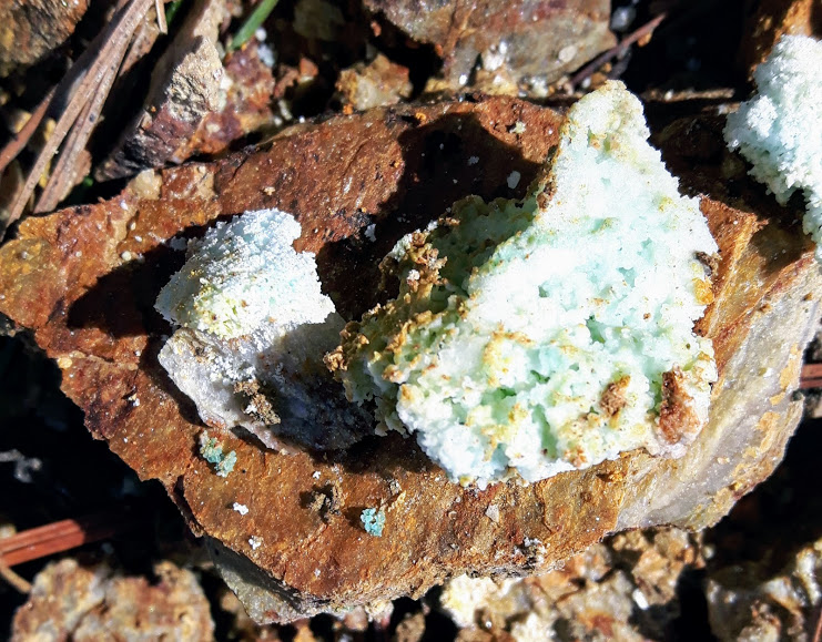 ...and, after the minerals in the schist decay there's a light recombination of the minerals, beautiful pale blue, turquoise, light - crumbles away in your fingers, but shaped like a coral or a brain, maybe a biological agent?