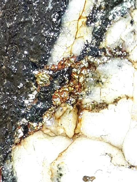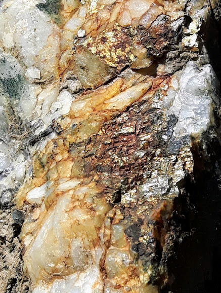 coppery colored fools gold in quartz (note the iron, good mineralization, worth grinding & checking for gold...)