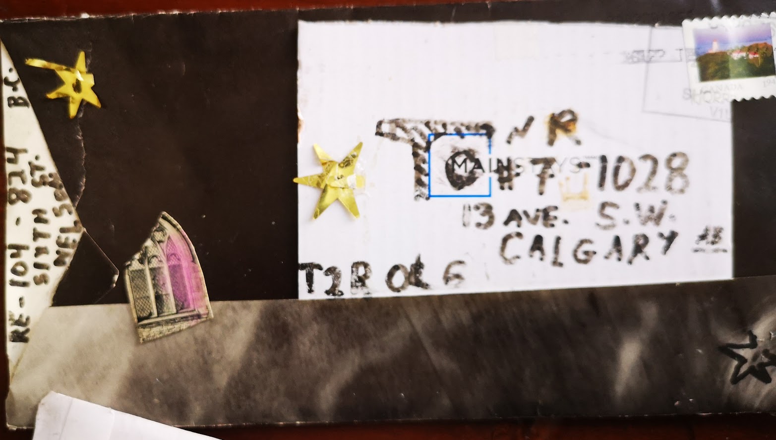 One of his finer home-spun envelopes, typically stolen from the passport office (renewal envelopes), then redone for my benefit.