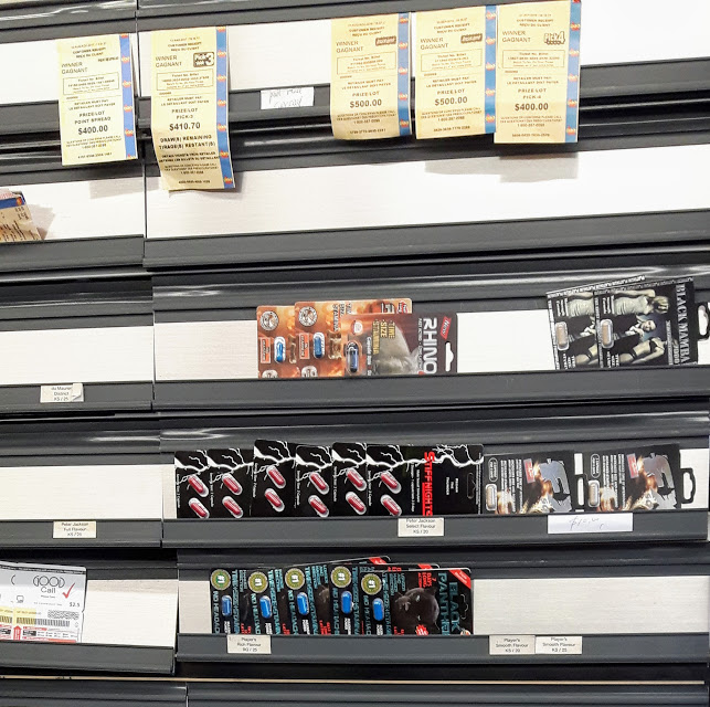 Everywhere the independently owned "variety" stores, for cigarettes, lotteries, etc. As you can't display cigarettes in Canada for fear of harming the psychology of young children the store owner here has thoughtfully displayed dozens of packages of herbal viagra...