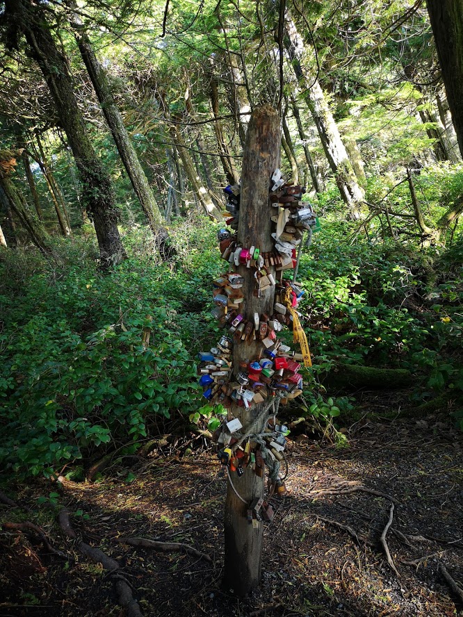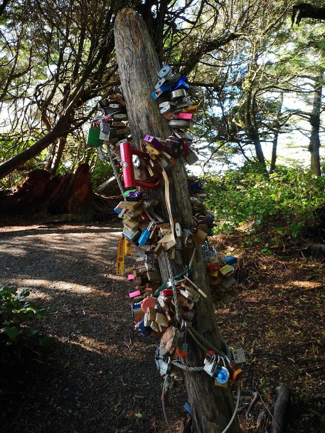 The "lovelock" tree, like those bridges in Europe that keep collapsing because lovers weigh them down with the protestations and visible seals of their love. Only this is a tree, in Ucluelet, already mostly collapsed/dead - probably not because of the locks.
