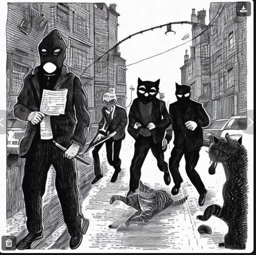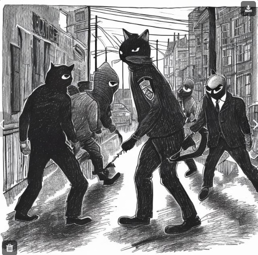 Trying to get it to generate pictures in the style of Edward Gorey. It's mastered (?? - somewhat) the style, but is having difficulty reading my prompts. For example, all images were generated from variations on the prompt: "A group of police officers chasing a masked bandit down the street at night, in the Style of Edward Gorey." I added a cat to one image. Results as follows: