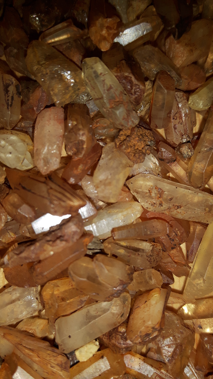 On hands and knees, by the torchlight of our phones we pass the next hour combing the fine gravel for quartz crystals, the sun has gone down and we're picking them from the slag, my evening's haul: