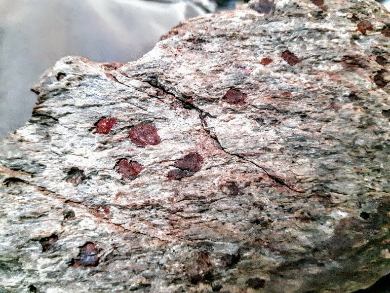 Only a small find, not of extraordinary interest, schist filled with garnet (or, given the color, red corundum, thinking maybe rubies)...