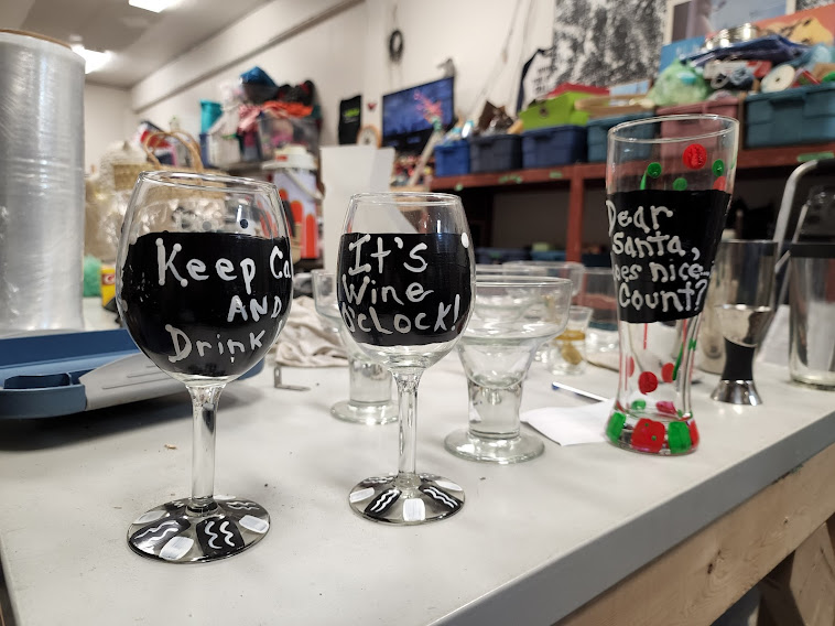 Hand Painted wine glasses and a festive beer glass. These will never sell. I put them out nonetheless.