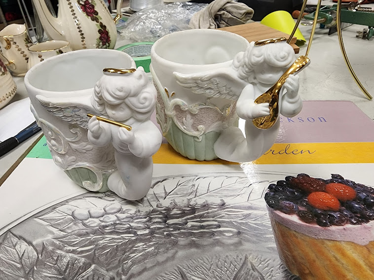 Unboxing, a porcelain flower arrangement, vintage, of the day, nightmare dust accumulator. Small Raku rolling tray. Cardboard bowl filled with "Made in Japan" ceramic porcelain figurines. A fabric wrapped coat hanger, a dirty cloth to wipe the dust off with, a basket, clean, with liner. A metal juice press.