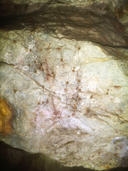 in the cracks on the ceiling some bigger, juicier ones who's species eludes me. There are some small transparent crystals in a ceiling pocket - quartz, but the positioning in the ceiling doesn't recommend collecting...