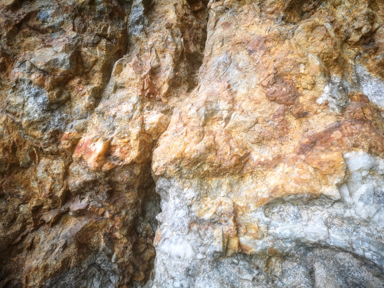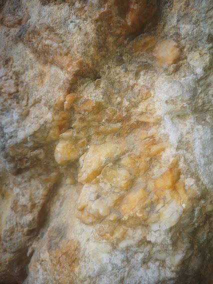 Looked like a mine, got out, yep, sure enough...notice the great yellowing seams of quartz. Very coarse and granular, on the verge of becoming crystals if only there were a pocket...