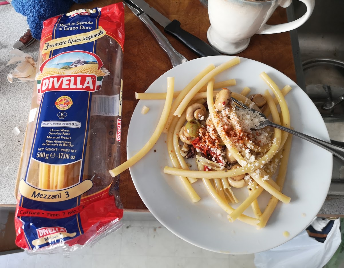 First of all, cooking it up, I generally wait until the bottom softens and then push the rest down to boil. That did not work. What happened is that those damned macaronis served like little geysers and funneled up the boiling water and sprayed it all over the kitchen. Eventually I had to break them into the pot.