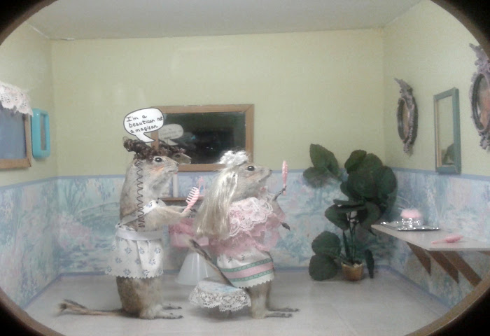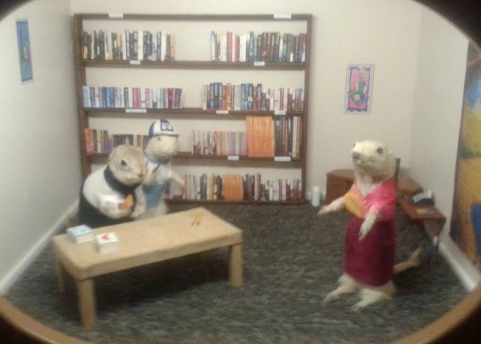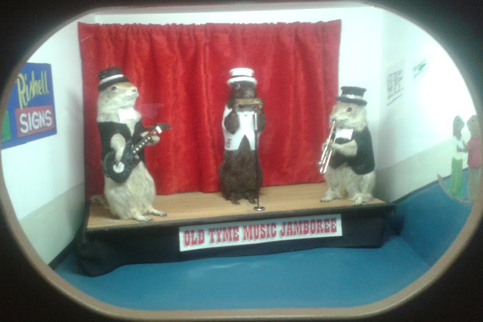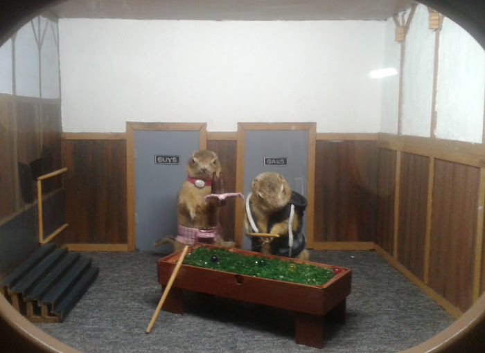 The Sunday before last, still deaf, off to Torrington to see the Gopher Hole Museum. I've been a couple of times, small, maybe 20 minutes, but it's cheap (2$) and a perfectly eccentric roadside attraction, anthropomorphic gophers posed in Dioramas, after Walter Potter or Ferenc Mere.