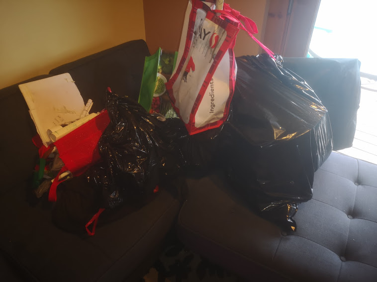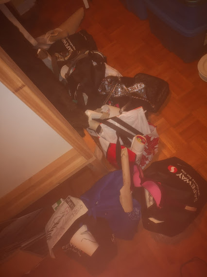 And so, today, after an unsuccessful morning of prospecting I head over. And there's a lot of shit. A dozen bags, purses, etc, all tied together with sting, yarn, rubber bands, you can't pick up one bag, you have to take them all, and god-damned, this place was clean for a full 2 weeks and now I have to do a major unboxing...