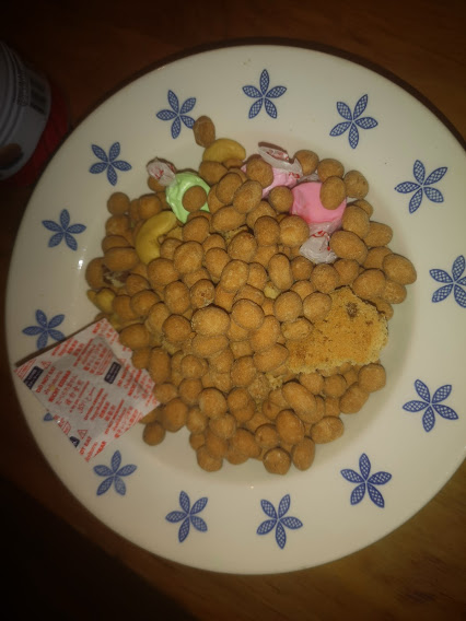 A bunch of salted (and probably licked) chick-peas, a couple of half-eaten cookies, 2 cashews, 3 salt-water toffee's and a silica desiccation packet.