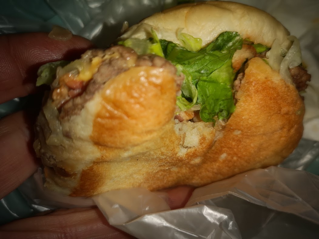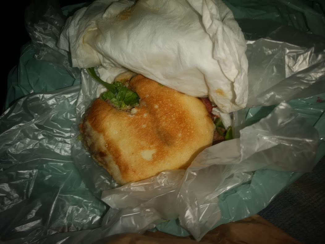 A burger, wrapped in 7 plastic bags and a used serviette. And - look closer ... is that a bite out of it?