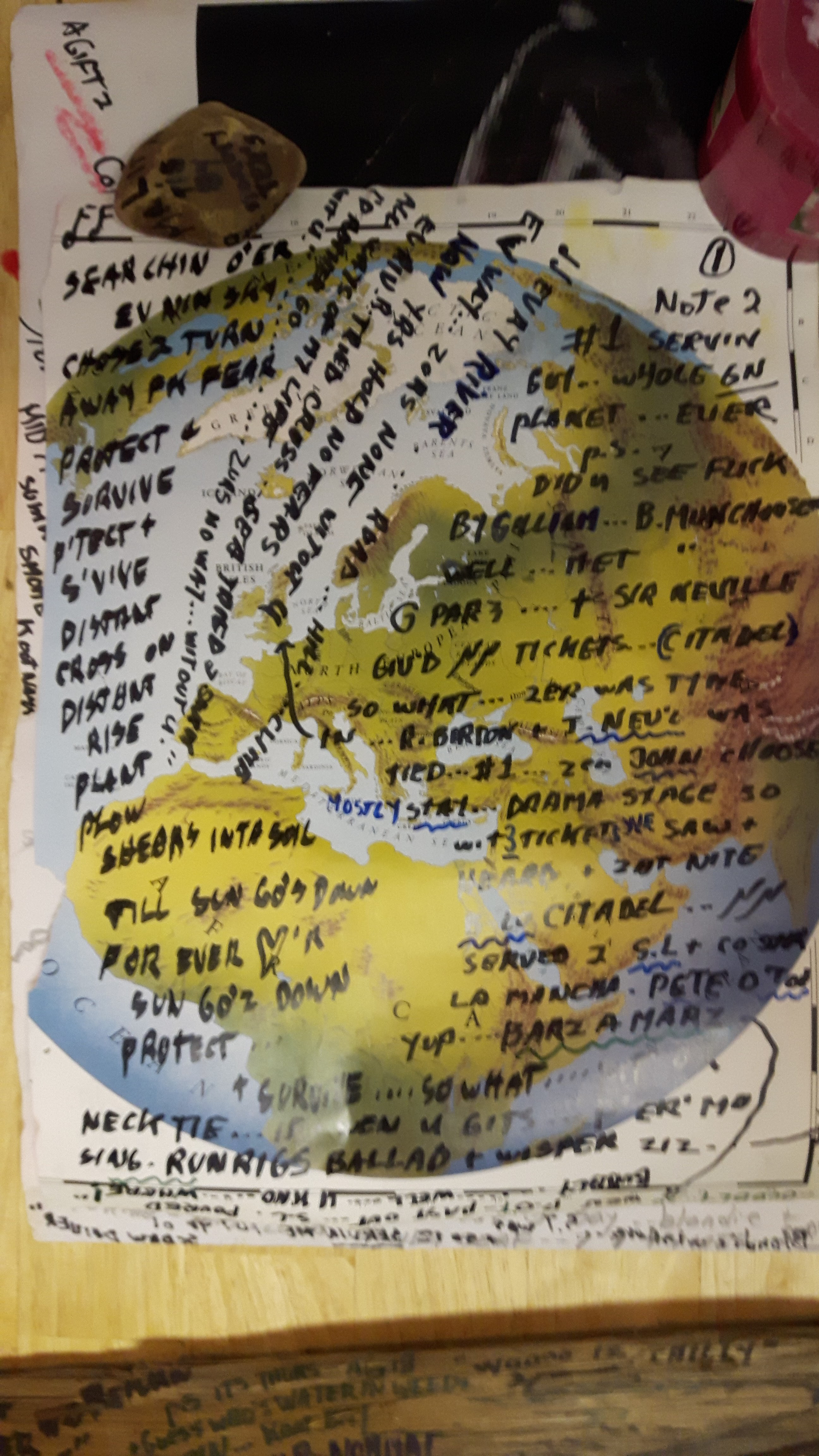 Various pieces of posters, a stick, a stone, found cards, with his elaborations and thoughts written upon them: