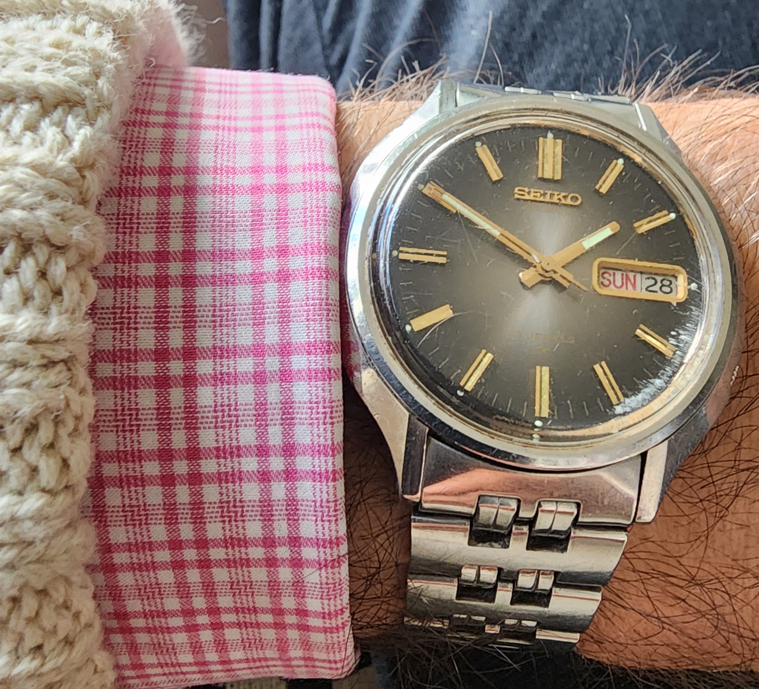 A 1977 Seiko in immaculate condition. I'm not a fan of Seiko (although their "Grand Seiko" line is apparently a league of it's own), but - the dial, the style, the retro, it's got it's appeal.