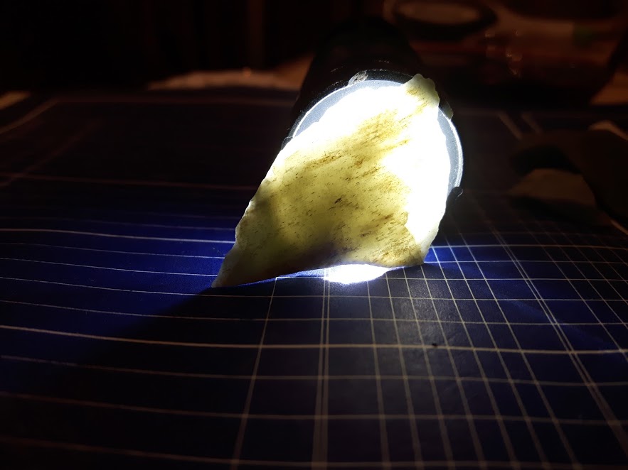 I'm not sure about the arrowhead, I was expecting something a bit more - well, complete, and obvious, but shining a light through it reveals the tiny pressure points where it was napped, the edges are serrated from multiple tiny flakes pushed off, it's an arrowhead, sure enough.