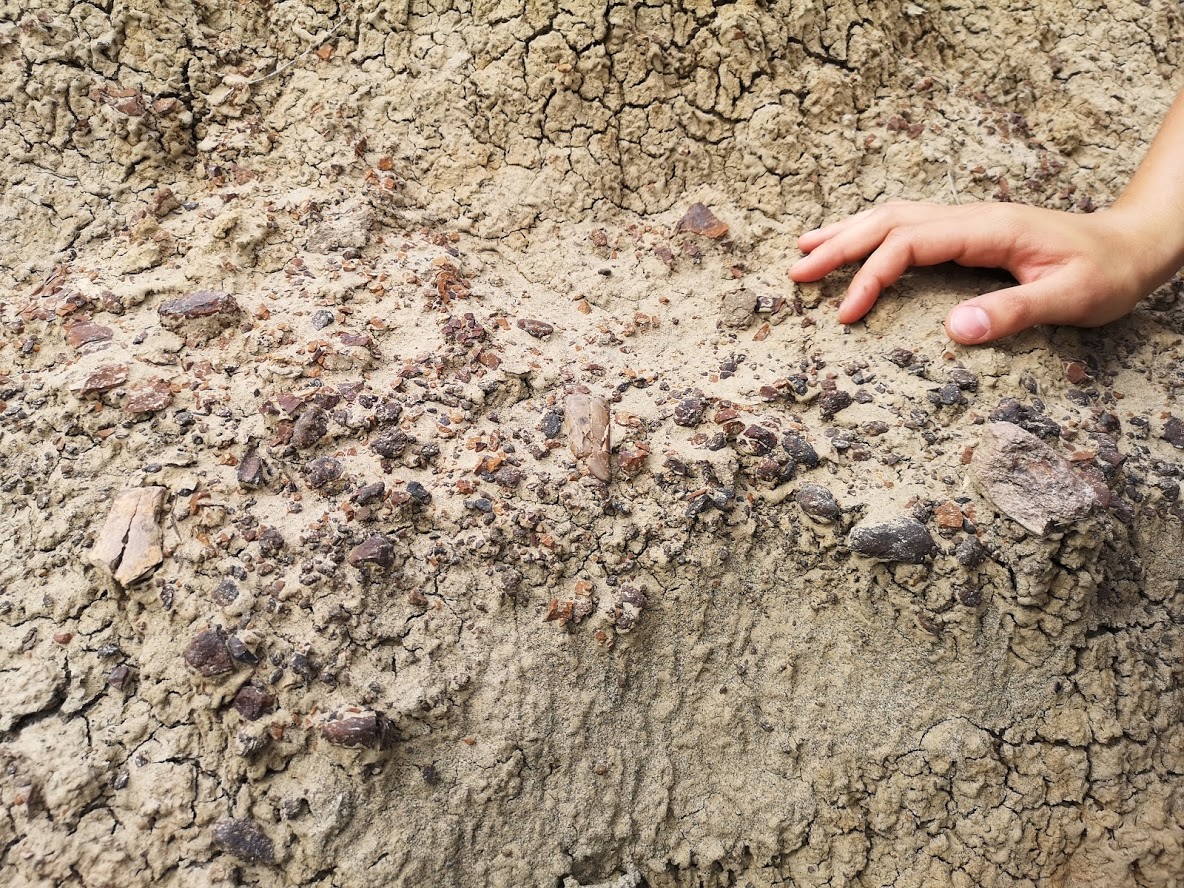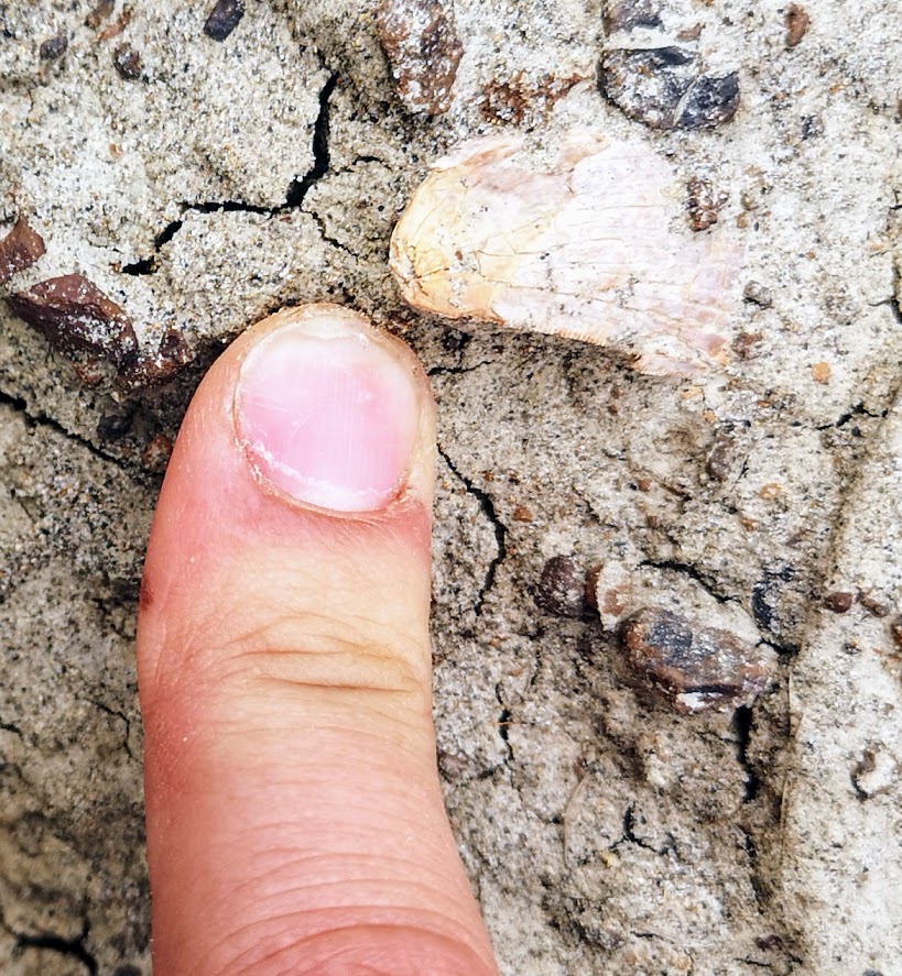 This one, about an inch long, but a thicker body than the last one we found. And, sliding down the hoodoo to check the bottom I make my big find of the day: