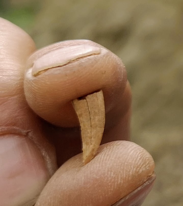 My raptor tooth (notice the serrations on the inside curve) - almost a full centimeter long!
