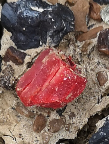 On the way out some little spots of amber in the dirt, beautiful orange and red but too degraded to do anything with: