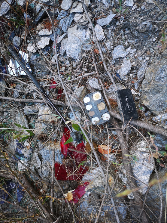 Out screening for garnets, the scene of a car accident (into the ditch/cliff, by the looks of things), scattered broken glass, miscellaneous things thrown from the car, including the "hidden key" (to a now useless car) and one of the organizing change purses, it looks better than it was, barely $10...