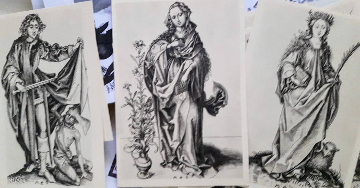 Postcards, vintage, some old copies of some famous woodgravings illustrating parables and saints: