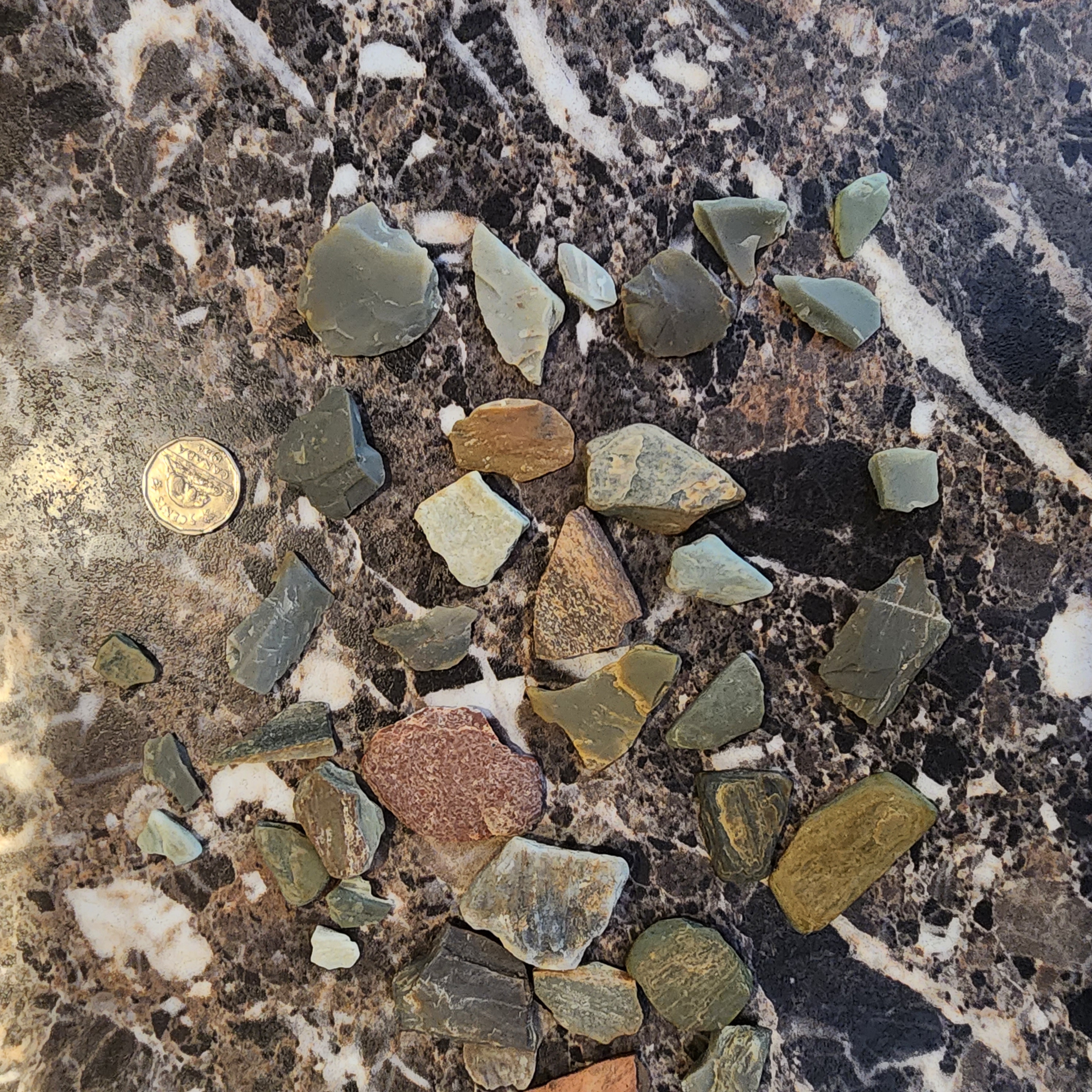 Above the loonie, top, orange, no local material (jasper) that had me stumped - a drill? - but a bit of searching informed me it was likely a fishhook. Clearly worked to a sharp point it would have been attached to a stick via the indents.