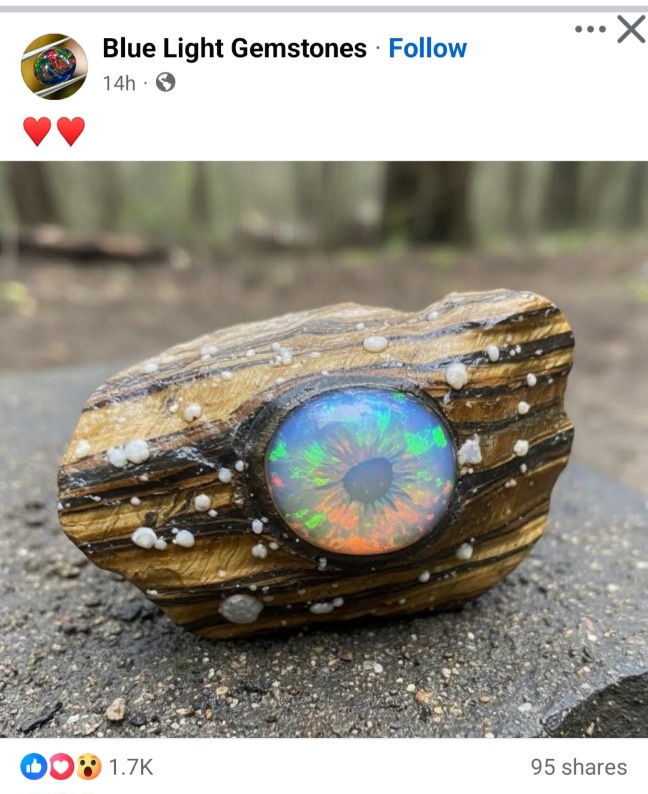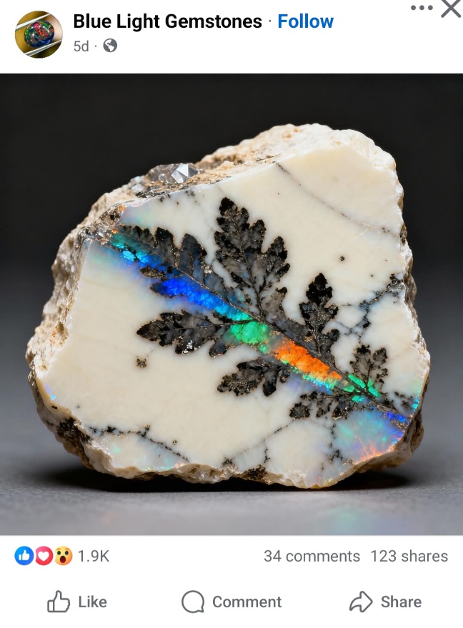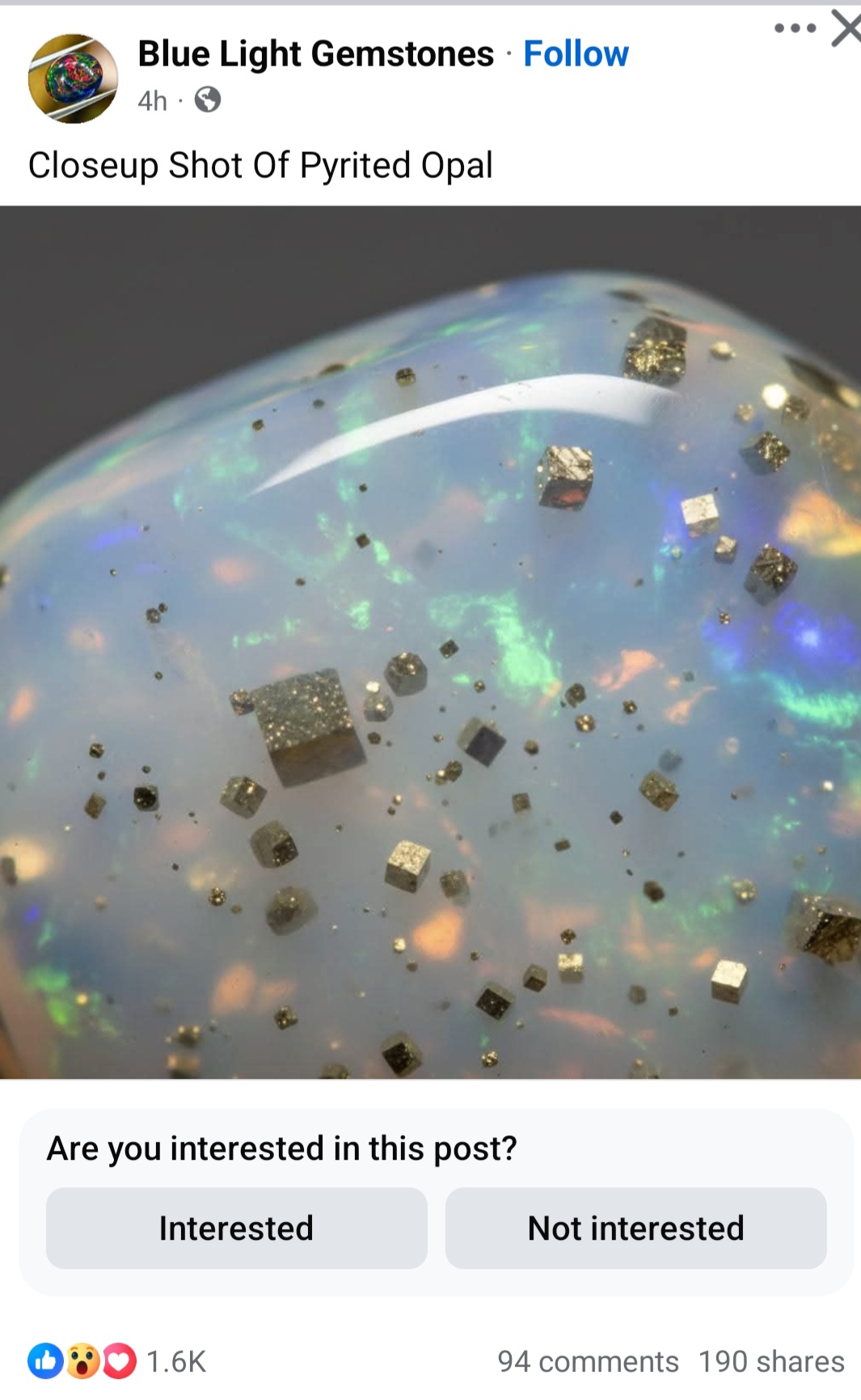 This, my facebook filling up with AI slop, pandering to my taste. Adverts for things that don't exist (search every website every link takes you to!!), posts about made-up-facts, or made up minerals like the few I'll post below: