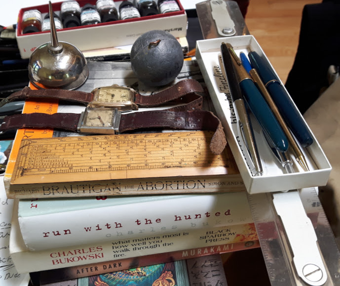 A successful mornings garage saling: 4 Books, Brautigan, 2 by Bukowski, After Dark by Murakami, Lead fishing weight (1 lb, what for I wonder?), antique ruler, oilcan, 2 antique Parker fountain pens and 1 gold mechanical pencil, 2 Scheaffer ballpoint pens, vintage watches...All in all a fine beginning to the day, and a whole town full of garage sales tomorrow in Ymir...