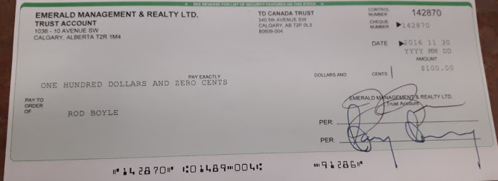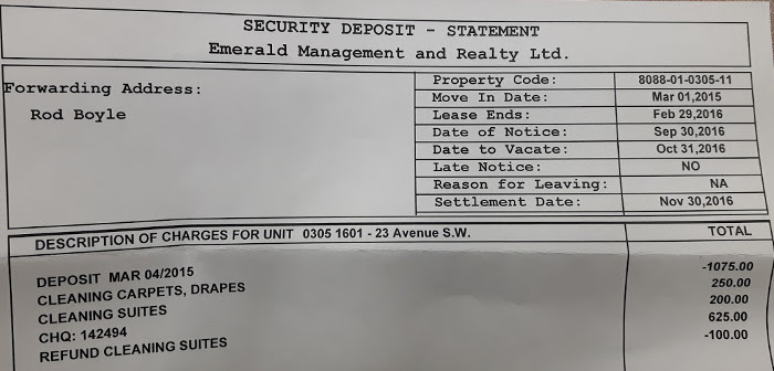 December 5th, back in Calgary, time to pick up my Damage Deposit from Emerald Property Management. I left no forwarding address, had none, told Marty (the onsite landlord) that I'd pick it up from their head office next time I was in Calgary.