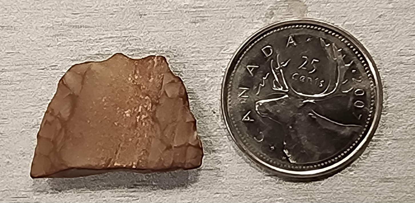 Red jasper, the tip broken off and then refashioned into a scraper. Judging by the wear on the edges a few thousand years old...
