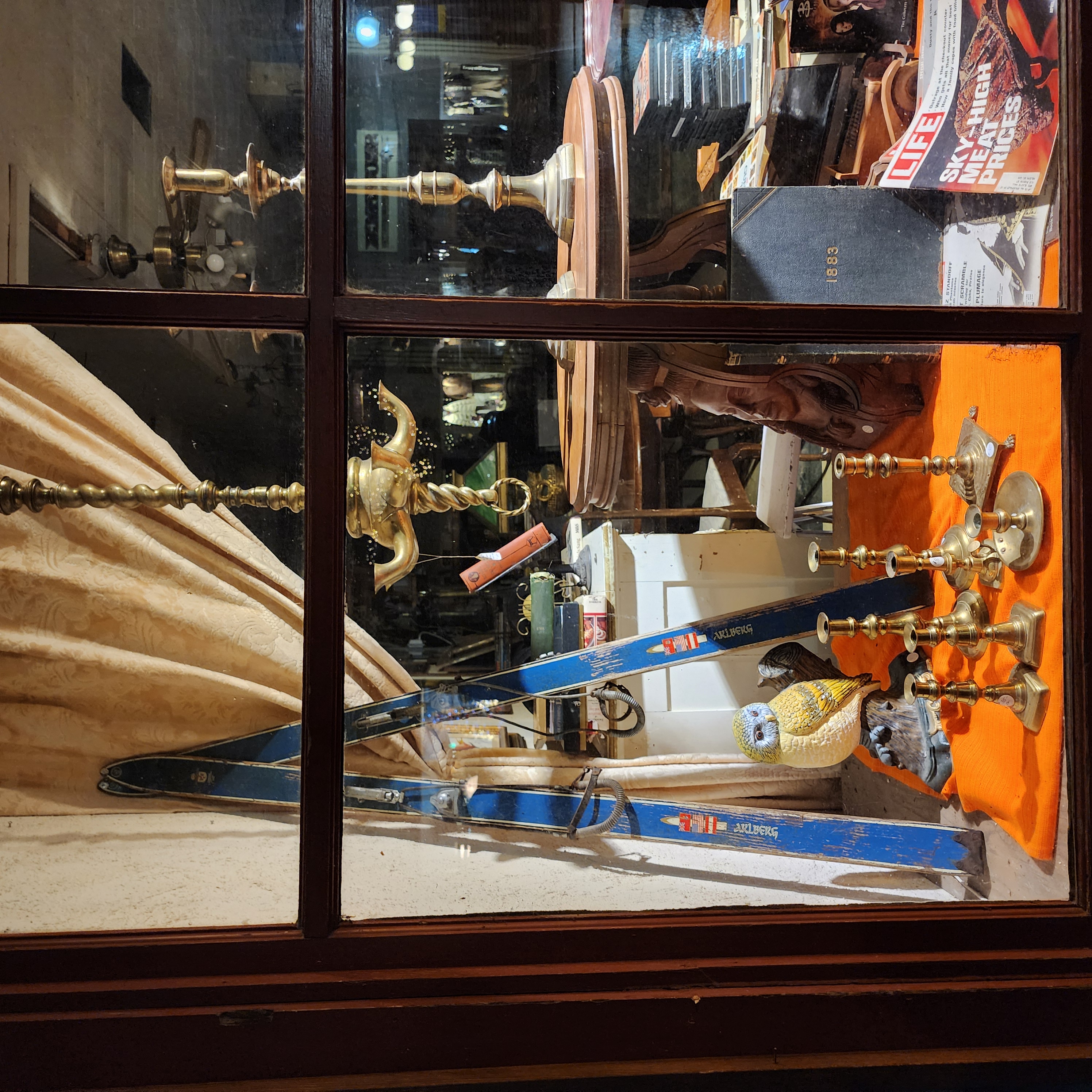 Finally, after several trips to the hardware store I find the part and hacksaw it down to fit the Oil Lamp, take it to the antique shop to hang in their window. The owner's as impressed with it as I am. The first time in 35+ years it's hung, it looks happy there, a fine stopover on it's way to a castle.